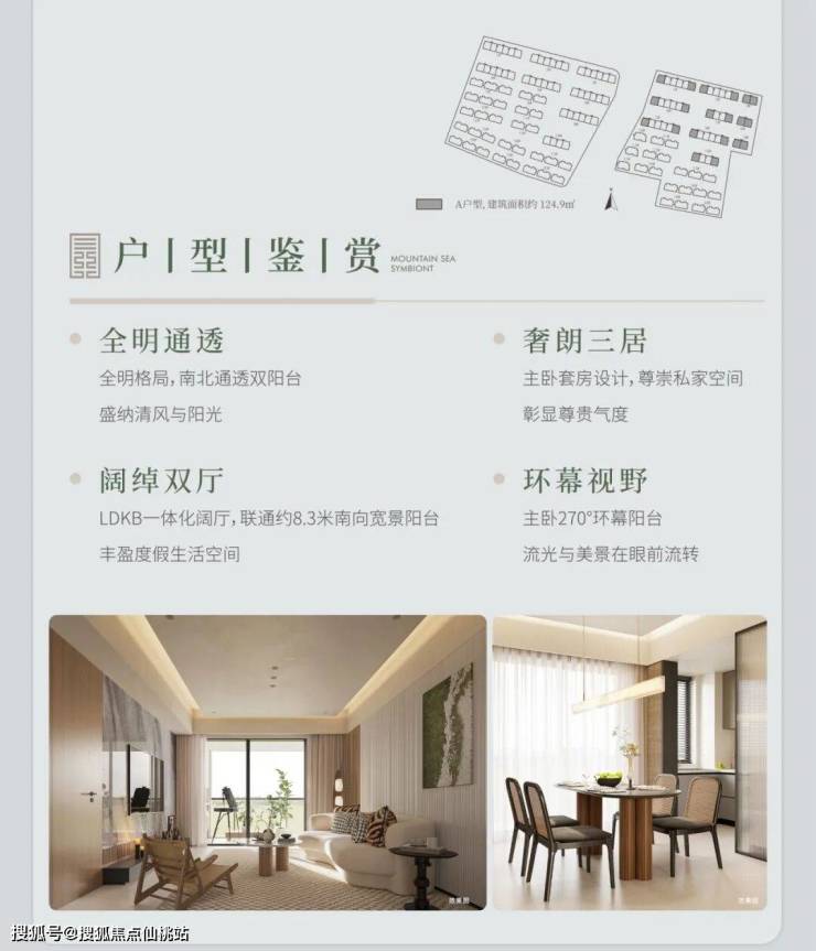 洋房 A 户型,建筑面积约 122㎡(或 124.9㎡ ),三室两厅两卫。全明通透,南北通透双阳台,主卧套房设计超有尊崇感。LDKB 一体化阔厅联通约 8.3 米南向宽景阳台,主卧还有 270° 环幕阳台,美景尽收眼底。