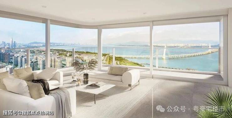 信悦湾主力户型客厅采用270°环幕无角柱设计,搭配弯弧玻璃、提升推拉门与大固定扇,将深圳湾大桥、歌剧院与城市繁华段全景引入室内,尽揽湾区美景。“L”形阳台则进一步延伸了观景界面,无遮挡直面海港景观。