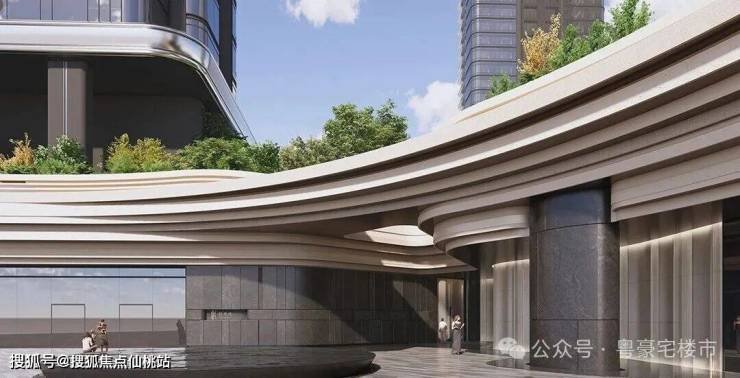 主大堂围绕中心下沉花园布局,搭配艺术环廊,打造兼具仪式感与放松感的归家体验。双大堂设计(步行仪式大堂+交通出行大堂),结合裙房入口悬挑一体化造型,打造高奢酒店式落客尊贵体验。