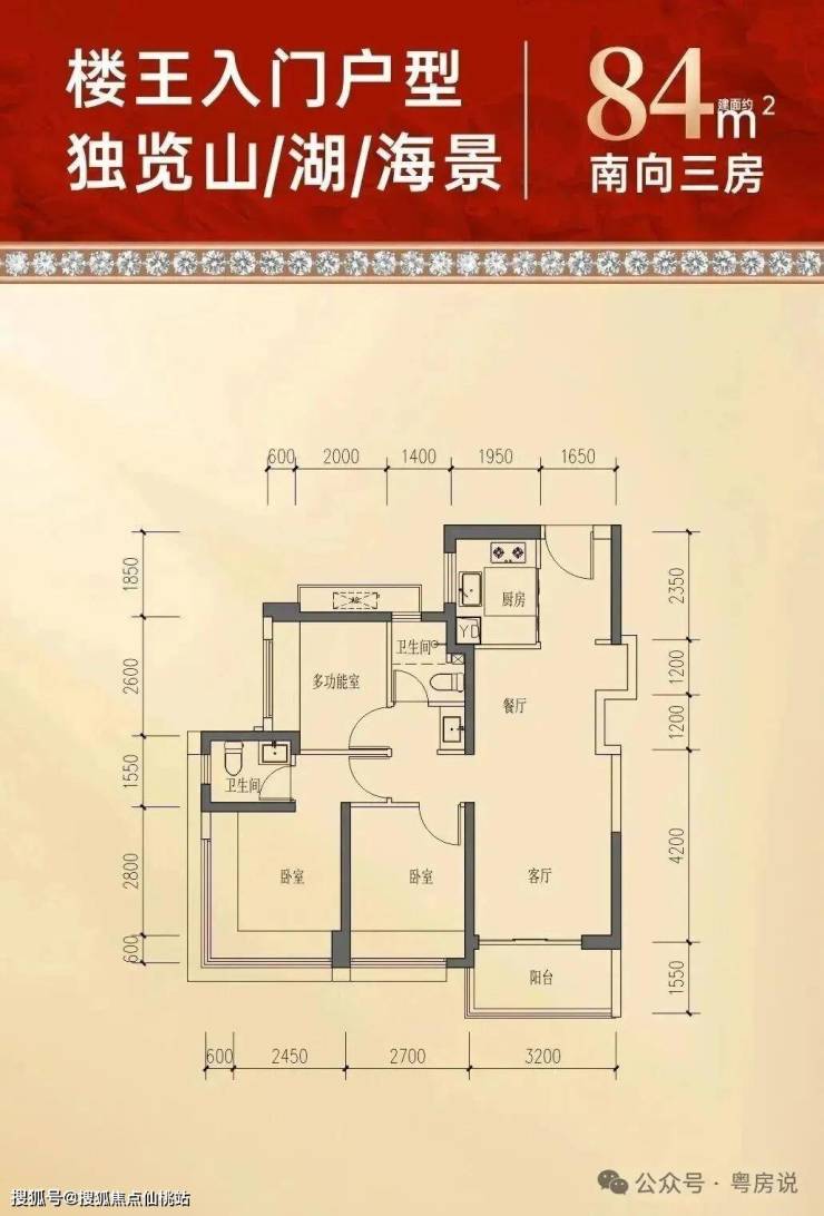 84㎡的3房2厅1卫,设计的是竖厅格局,客厅3.2米开间,LDKB一体化,S墙设计预留冰箱卡槽位,3个卧室分别做到了主卧10.37㎡/次卧9.18㎡/次卧7.54㎡(包含墙体飘窗),U型厨房,卫生间三段式分离,得房率约77%(不含赠送),东南或者西南朝向。
