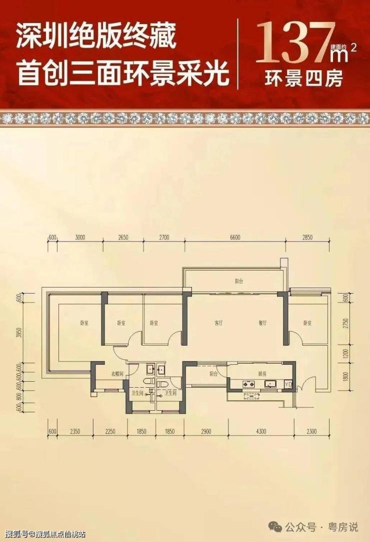 137㎡的4房2厅2卫,是大横厅双阳台南北通透格局,客餐厅6.6米开间,LDKB一体化,五开间朝南,约93%超高使用率(含赠送)