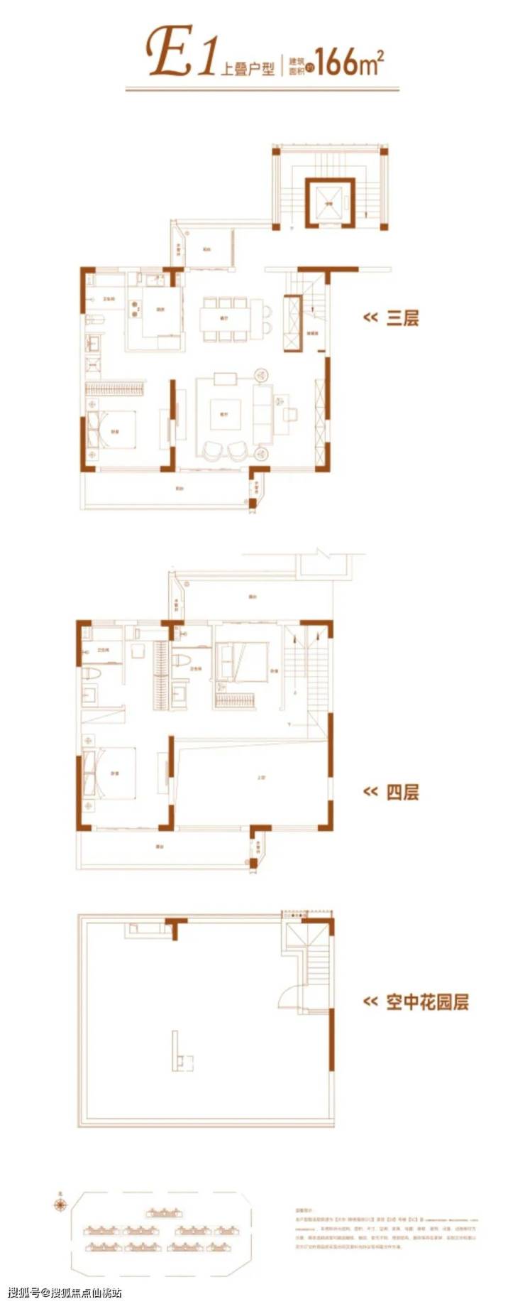 上叠(166㎡):四房,三层(含露台),带约 93㎡星空露台,无花园 / 地下室,地上层高 3.3 米。