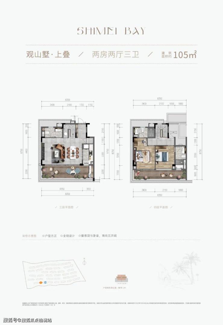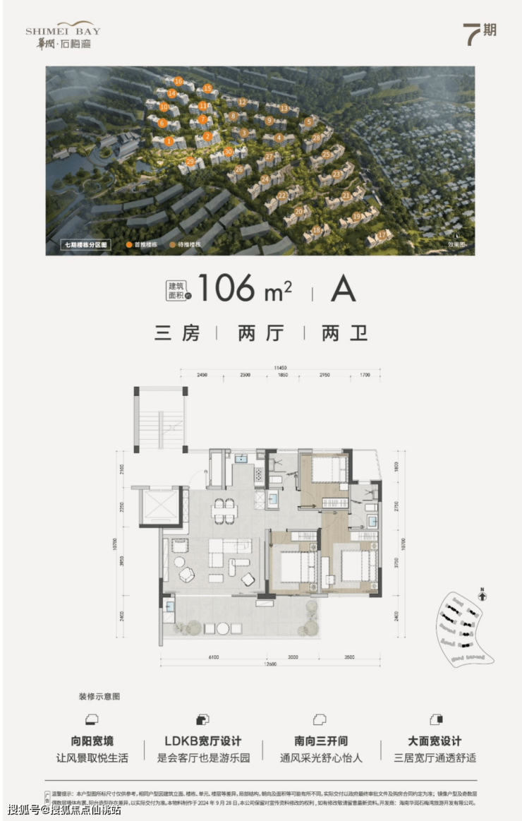 |建筑面积约105㎡○三卫设计,舒适起居,生活自在不拥挤○户型方正,全明设计,纵览山海风景○LDKB专享度假感格局,丰富生活层次○餐客厨与卧室,南向三开间,阳光满室○套房式主卧,约8.4m朗阔阳台,环瞰山海