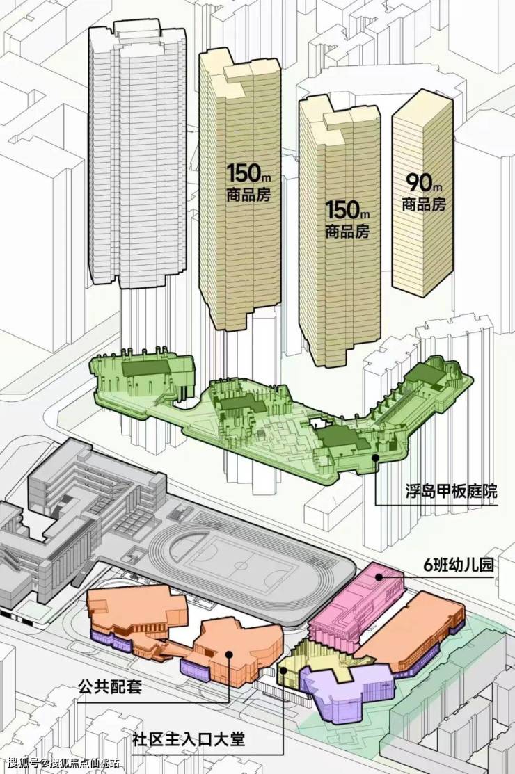 利用裙房屋顶打造拥有“仪式水轴“艺术庭院”“空中浮岛森林”三级景观设计的空中庭院,四栋住宅均漂浮于甲板之上,独享甲板庭院花园,以“海风吹拂下的豪宅底盘”托举城市上空的豪宅群落,形成立体景观系统。