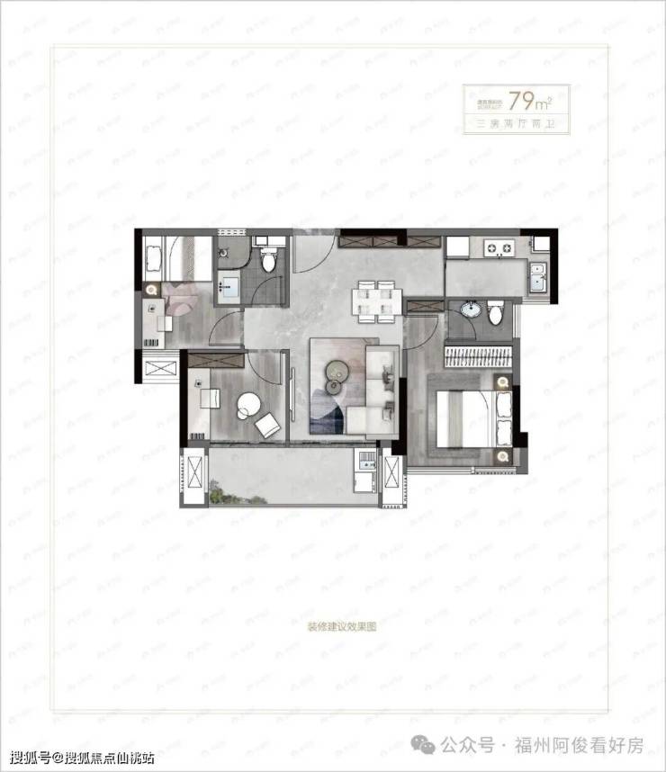 79-127㎡三至四房,覆盖刚需 / 刚改,79㎡做三房两卫,得房率高。