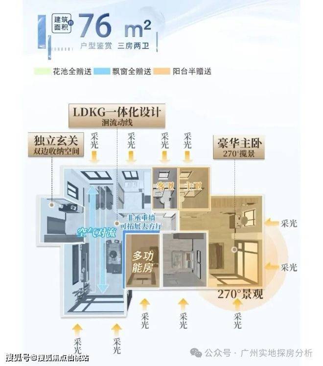 1、户型设计创新作为广州首个“0飘窗”楼盘,通过合理利用赠送面积,实现约120%的高使用率,小户型空间利用率显著提升,如76㎡三房两卫户型功能齐全,采光通风良好,居住舒适度较高。