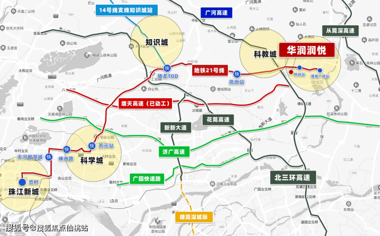 项目地处21号线山田地铁站与钟岗地铁站中间,距离都2公里左右,走路基本要半个小时,很明显的不现实,最好的骑个电动车接驳,家门口3000㎡润悦花园公交首末站,接驳地铁,坐地铁一个站到增城广场站换快线,5个站就可以到天河。