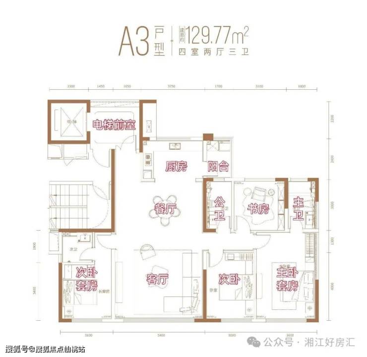130的户型格局也与123户型基本一致,空间、尺寸继续升级,客餐厅的开间做到了约5.4米,已经有大平层壕宅的既视感了。
