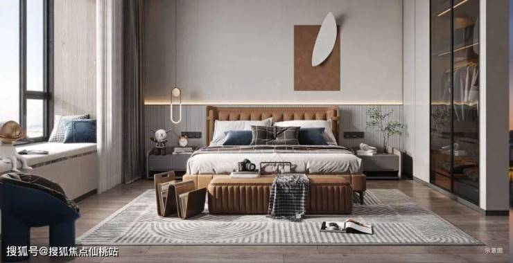 主卧套房同样借鉴酒店打造灵感,奢享L型全景飘窗+独立衣帽柜,让每一次起居皆成为奢享仪式。