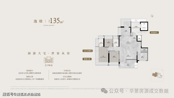 135㎡四房:高端改善户型,空间更宽敞舒适,适合三代同堂或高端居住需求。135㎡户型采用主卧套房+双次卧+多功能房配置,三面采光,视野极佳;客餐厨连通,预留新风系统接口,主卧自带独立卫生间、衣帽间与飘窗,双次卧适配老人与孩子居住,得房率超85%,实际使用空间充足。