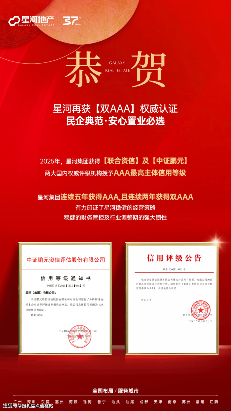 在楼市波动的当下,星河集团以“做500年品牌”的长期主义,成为穿越周期的稳健担当——连续5年斩获AAA主体信用评级(联合资信、中证鹏元双机构认证),从未上市、不借美元债、无表外融资的“零杠杆”模式,让每一分投入都聚焦于产品本身,这份“不玩金融、专心盖房”的执着,正是购房者最坚实的安全感来源。