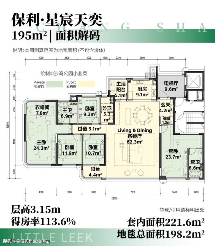 此次保利星宸天奕的户型整体而言综合性很高,从刚改、改善到一步到位都有,但195㎡大户型并不多,仅2栋,位于B3和B6栋,从楼栋分布来看,也是此次的楼王栋。