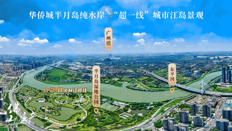 确实,从航拍视角可以清晰看到,于项目7座——ONE84向外看,近处32万㎡半月岛湿地如翡翠铺展,白鹭群掠过粼粼水面;东平河2.8公里的江道景观线,则筑就岛岸静观潮起潮落的静谧意境;万里无云的昼夜,甚至可以遥望湾区城市级地标——广州塔。