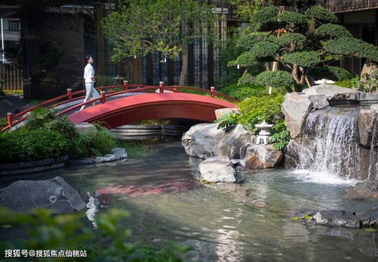 以松树、磐石、清泉等元素,搬来皇家御用石材——“山西黑”,打造山瀑叠泉。在亭台两侧,精选3棵名贵而稀少的罗汉松,将古琴“松石间意”转化为“松下抚琴”的雅致场景,打造山水意韵与松石之境。