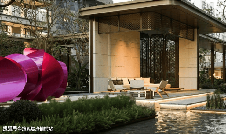 移步社区精心设计的“玉榭”庭院会客场景,精雕定制方胜纹格栅若隐若现,与《玉夏花漾》艺术作品共同营造花林水院间的隐奢意境。