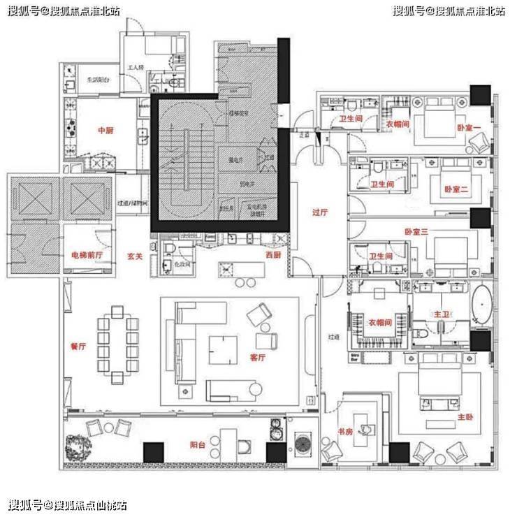A户型 304.3㎡ (套内约350㎡),5房5卫2厨+保姆房;框架结构,只在边缘有承重柱,这种结构的房子感觉会非常的大气。