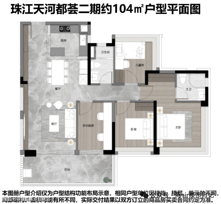 105㎡四房两卫,带入户花园,餐厅有飘窗,可与客厅、阳台形成南北对流。