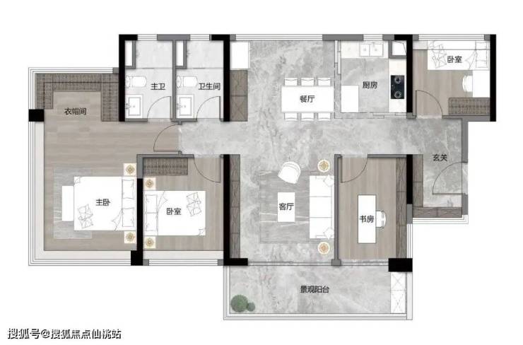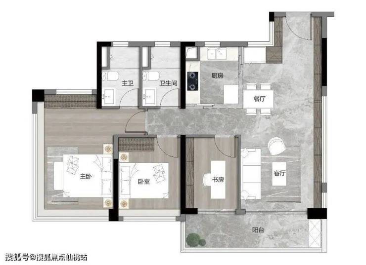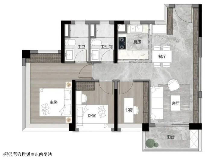 72㎡就做到三房两卫,四开间全南向,玄关位置可打造收纳柜,主卧是套房设计,带L型超大飘窗。