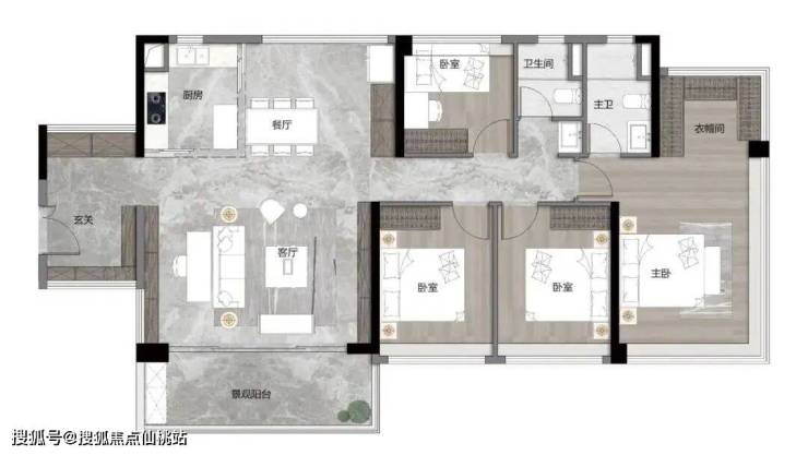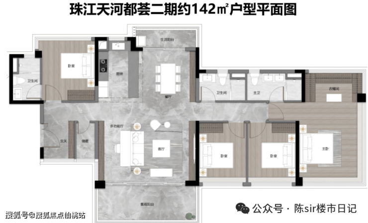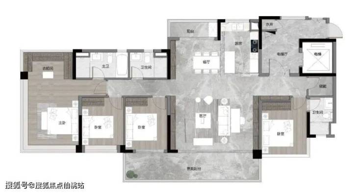 123㎡四房两卫,独立入户花园,南北对流,动静分区,厨房带岛台设计,客厅开间约5.8米连通大景观阳台,南向卧室空间都很大,主卧带衣帽间+270°大飘窗。