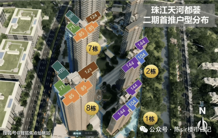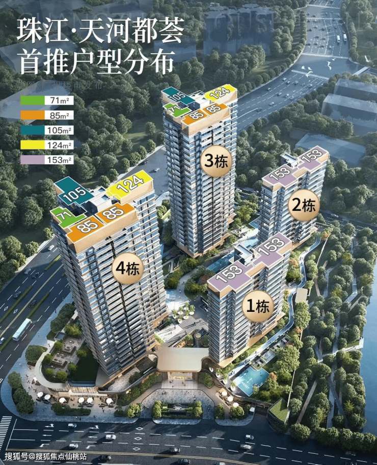 珠江天河都荟,总占地面积5.5万㎡,总计容建面11.56万㎡,分南北两地块开发,首推北地块,容积率2.0,共4栋,货量284套。首推建面约72-152㎡,户户朝南,超宽楼间距。