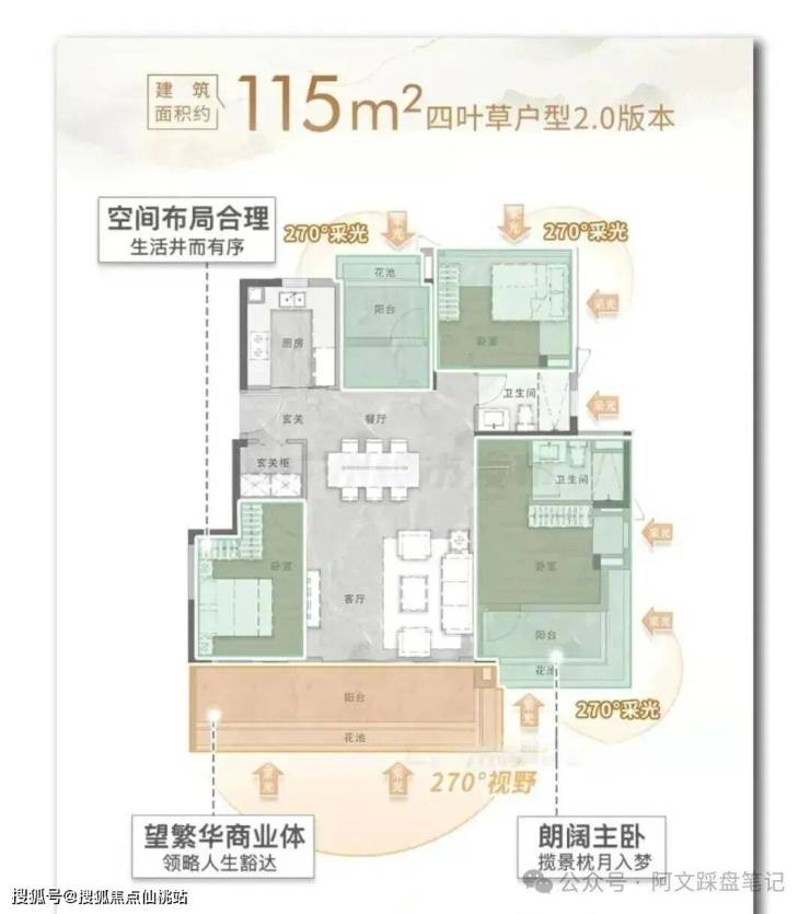 另一个则是户型本身独具魅力,没有选择传统格局,而是带来更新潮的“四叶草”户型2.0版本。