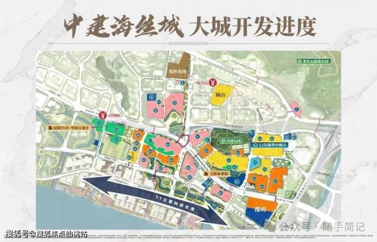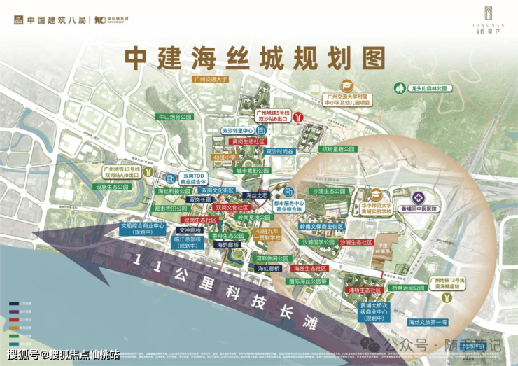 中建海丝城是广州市“十四五”规划中老黄埔双沙旧村改造的核心工程,被定位为“广深科技创新走廊的产城融合示范区”。由中建八局和知识城集团联袂打造,占地面积214,900㎡,建筑面积823,200㎡,总规划7个组团,容积率4.59,绿化率35%,车位配比约1:1.12。