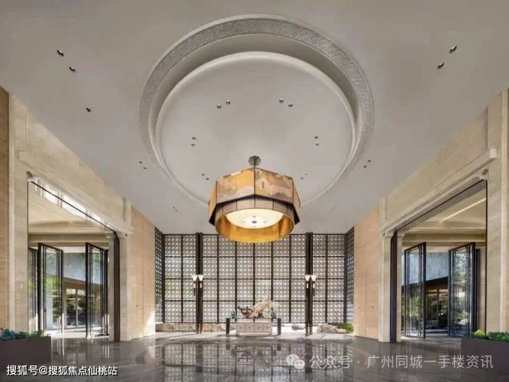 穿过大门,便抵达以岭南名园“余荫山房”为灵感打造的“余荫山堂”会所大堂。这里空间高挑,光线透过精致的格栅与窗棂洒落,营造出静谧而富有文化韵味的过渡空间。而真正的惊喜,在于步出会所后豁然开朗的“中天云庭”。