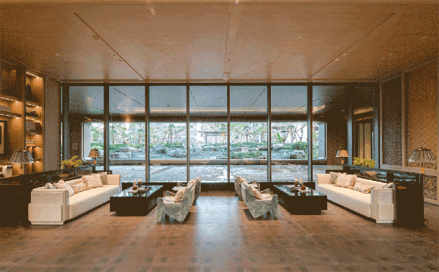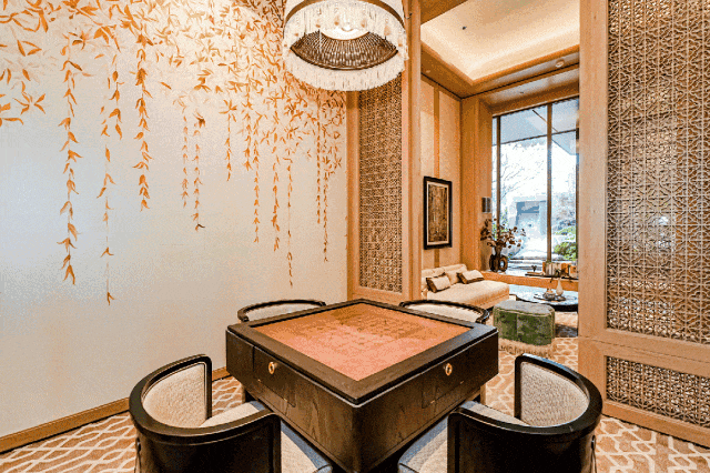 光影流转的祥纹吊灯、烫金工艺的游园主题画作、若隐若现的祥云纹玻璃屏风,每一寸空间,都旨在让人放松身心。