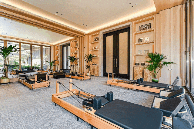 健身房大片落地窗围绕下沉式园林,无论是练瑜伽还是跑步锻炼,心境都更加自然疗愈。