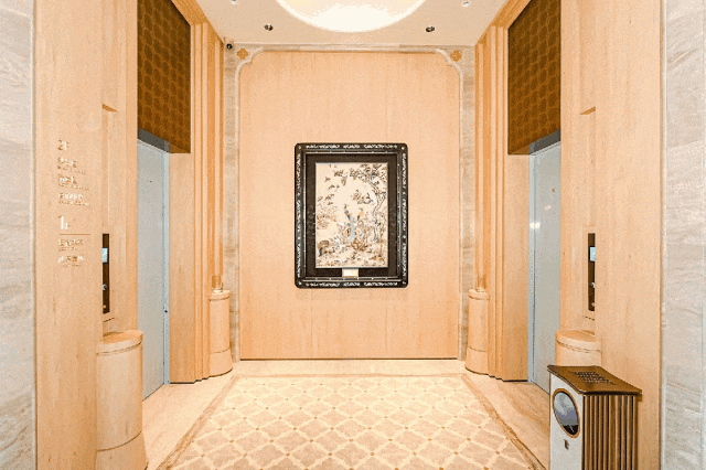 就连艺术电梯厅,也不会遗漏任何一个细节,除了圆弧石柱和祥纹地板,还按照不同楼栋主题,专门布置艺术品陈列,让每一次等待成为美的享受。