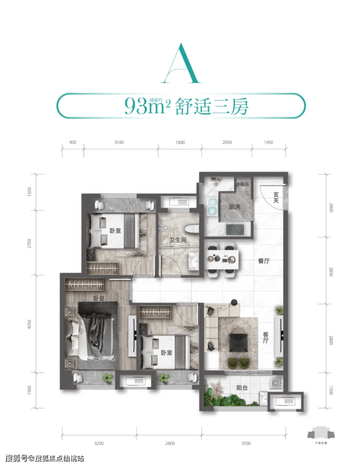 A户型:约93㎡ | 3房1卫 | 均价12800元/㎡