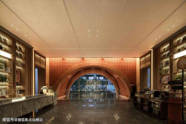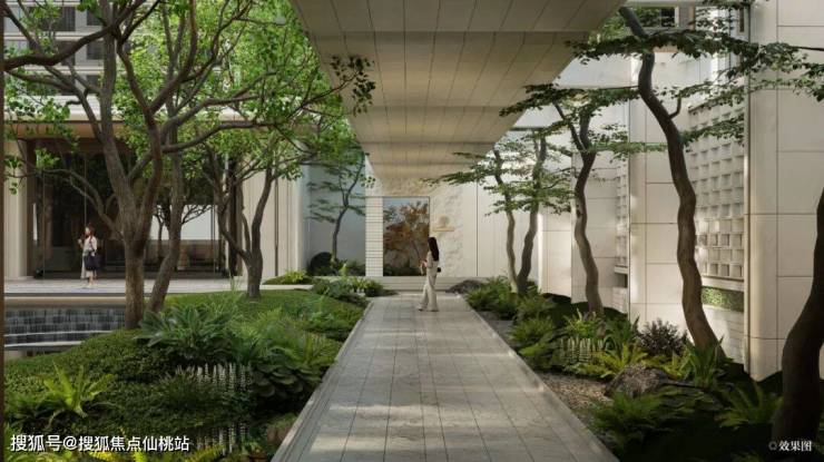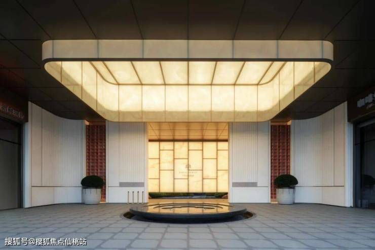 步入「阔景门庭」。南大门以约32米宽奢挑檐、约6.6米层台高门,中央设计圆形涌泉叠水,黑金沙水景池底,两侧特选朴树与红枫,米白色石材与学院色陶砖沉淀出知识的气息。