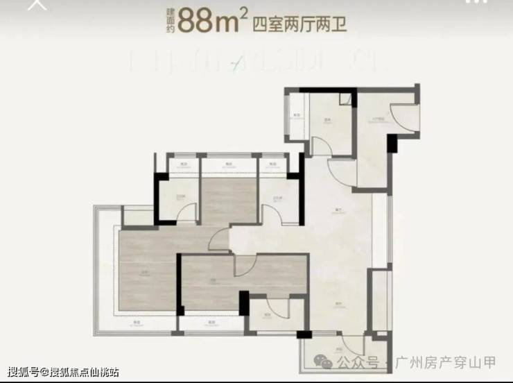 88㎡四房两卫:片区唯一 90㎡以下新规望江四房,横厅五面宽朝南。