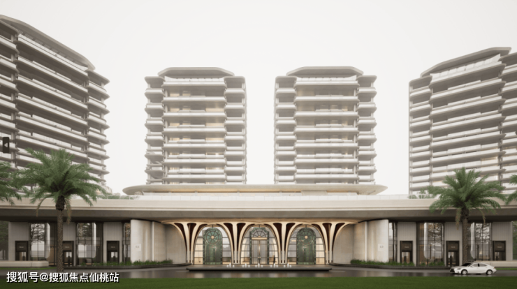 采用轻盈独特的滨水风格和海洋文化流体美学进行立面设计。以天空游轮为灵感,流畅的弧线设计立面采用幕墙设计+曲面玻璃,体现自由浪漫的滨海气息。
