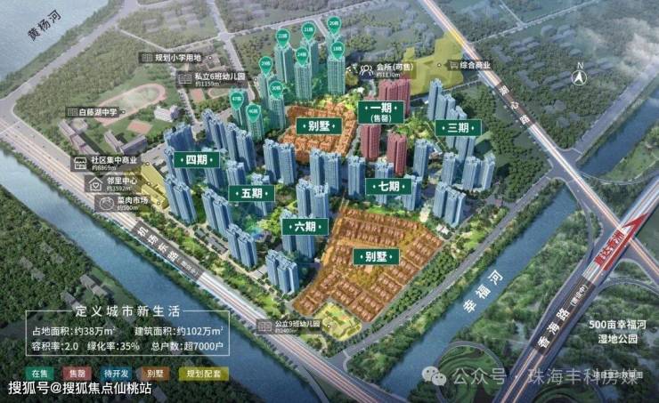 建面约102万㎡,规划超7000户业主。▫绿化率39%;容积率2.0;低密度舒适社区。▫规划配套2所幼儿园、会所、邻里中心、菜肉市场、社区商业,全系醇熟配套