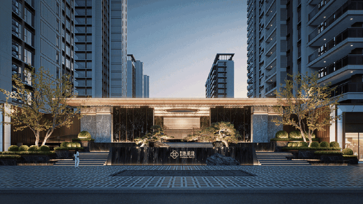 长约35米的绮丽门厅,以现代建筑手法呈现东方美学,景观层层递进。石阶步步抬升,两旁栽种名贵罗汉松,寓意招财开运,吉祥如意。