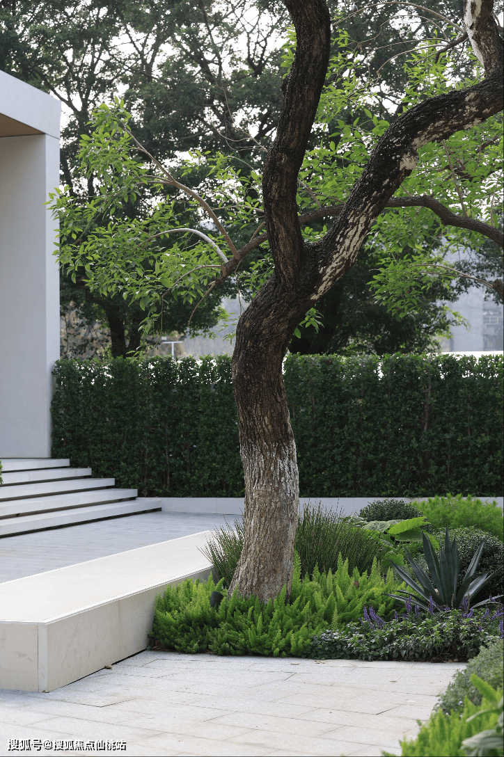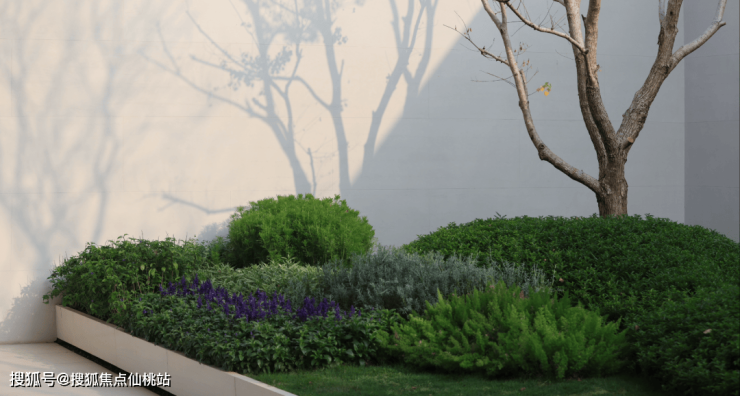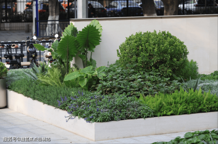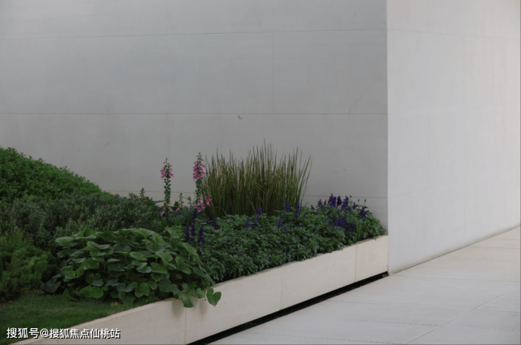 3、蓝紫色植物散种在外围较高一级的花坛,柔软的植物与主角的对比,不仅能衬托出线性植物的精致,自然“耷拉”的枝叶悄然修饰着高大的坛壁。