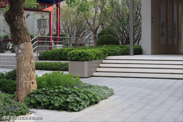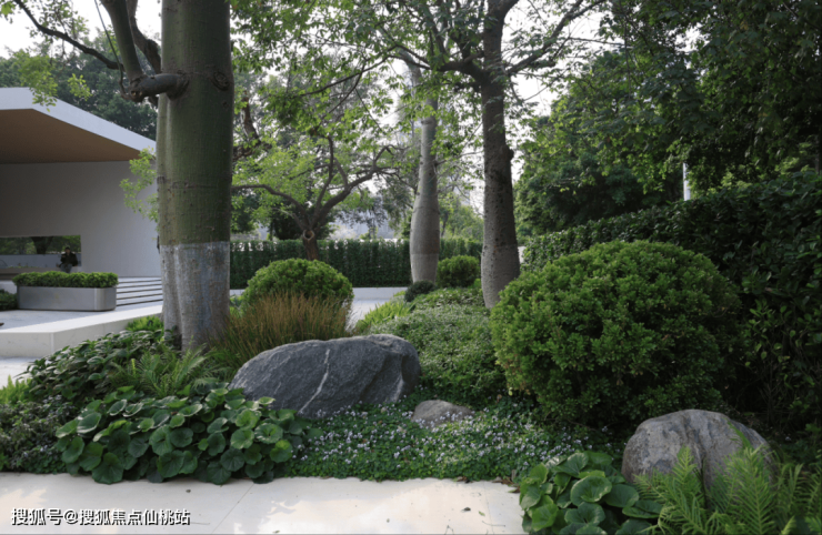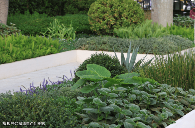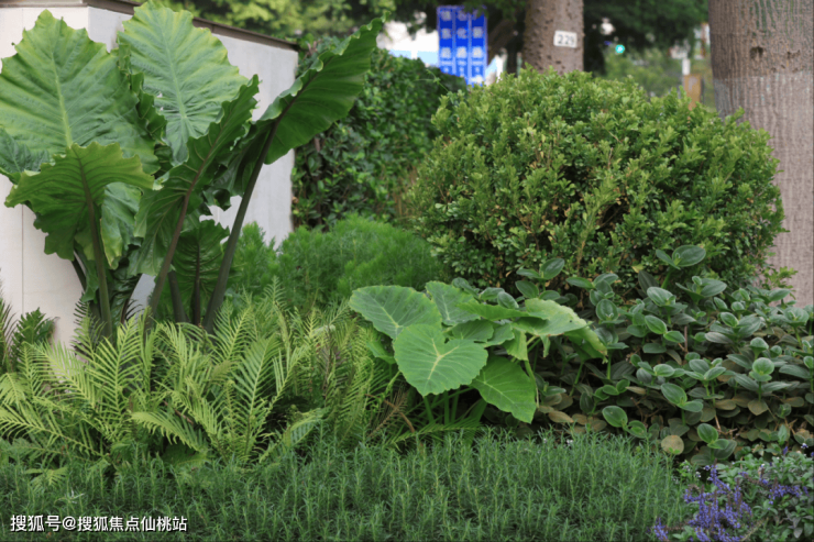1、基底层选用饱满细腻的[小叶植物确保花境不露土,[巨无霸玉簪]点状形式布置,大叶植物点亮满铺的细叶基底。