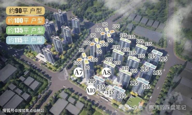 塔楼户型:主推90-100㎡三至四房,采用2梯4户设计,高25层,部分户型为全南向设计,采光和通风较好,但公摊相对较大,实用率略低。