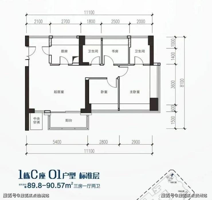 建面约90㎡3房2厅2卫,位于C栋,东南朝向,南北通透横厅布局,看向小区花园。
