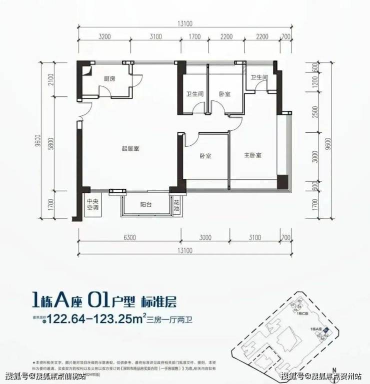 建面约123㎡4房2厅2卫,01户型位于A栋,东南朝向,南北通透,居住舒适。