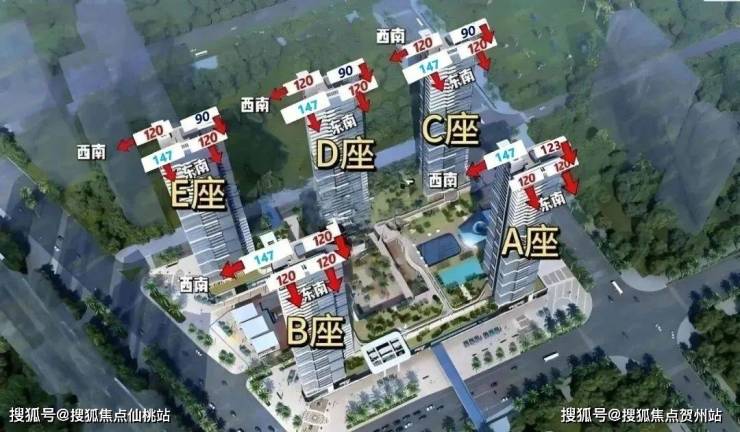 由1栋A、B、C、D、E五座及底层商业组成,配备有幼儿园、游泳池等。其中A、C、D座为43层,B、E座为41层,均为3梯4户的设计。