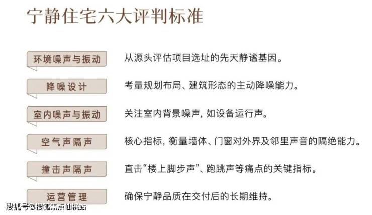 整体从环境噪声与振动、降噪设计、室内噪声与振动、空气声隔声、撞击声隔声、运营管理六大维度,从环境静、室内静、邻里静出发,对住宅的声环境进行严苛评分。