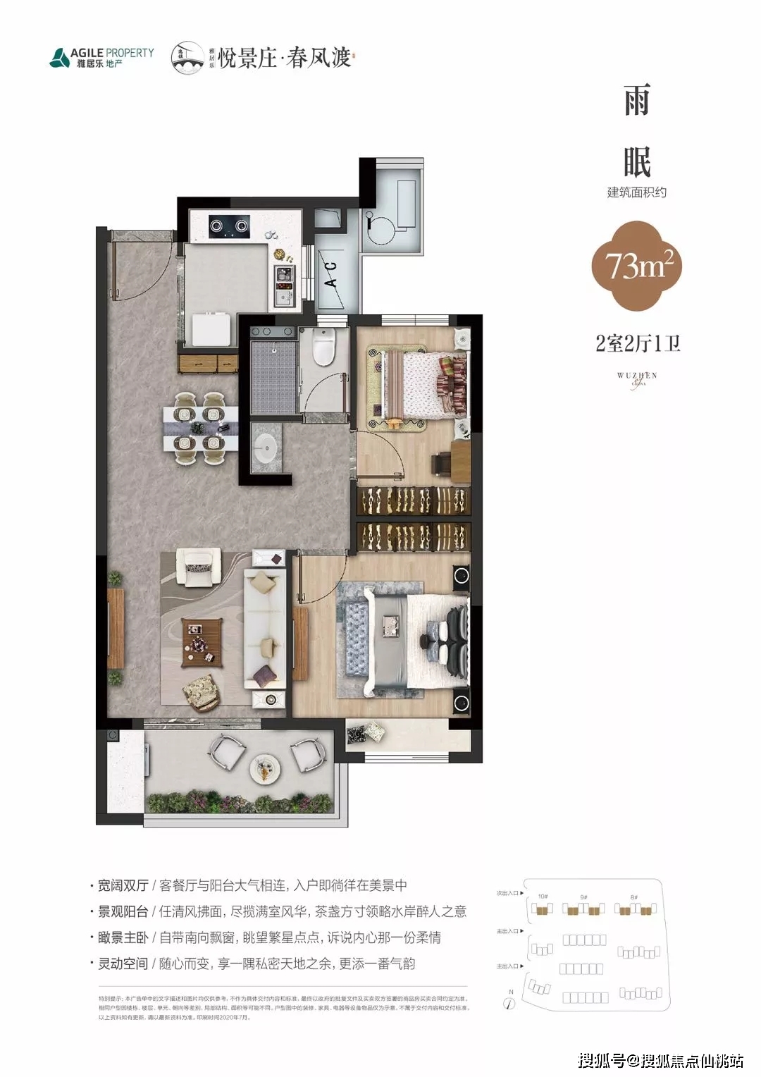 雅居乐悦景庄春风渡,项目位处乌镇子夜路北侧、乌镇大道西侧,总占地面积约3.1万㎡,建筑面积约9.59万㎡,容积率2.28,由7幢13-17层高层、3幢6层洋房组成。社区地理位置优越,靠近城市主干道,直达桐乡主城区。毗邻国家5A级景区乌镇古镇,自然景观丰富。项目周边生活设施及配套较为成熟,学校密集人口集聚,区域成熟度高,演绎“一生乐活”的优质人居。