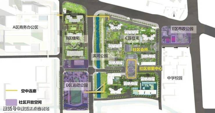 住区绿地、生态滨水公园、运动公园和街角社区对外开放空间,共同营造多层级丰富的绿色空间联动大社区,为都市塑造循环共享的社交网络。