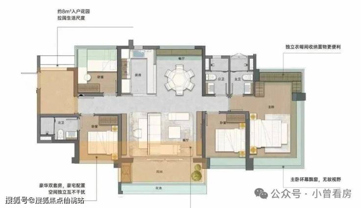 建面130平四房,LDKB大方厅,客厅就有57平,还做了双主套设计,豪宅的配置互不干扰。