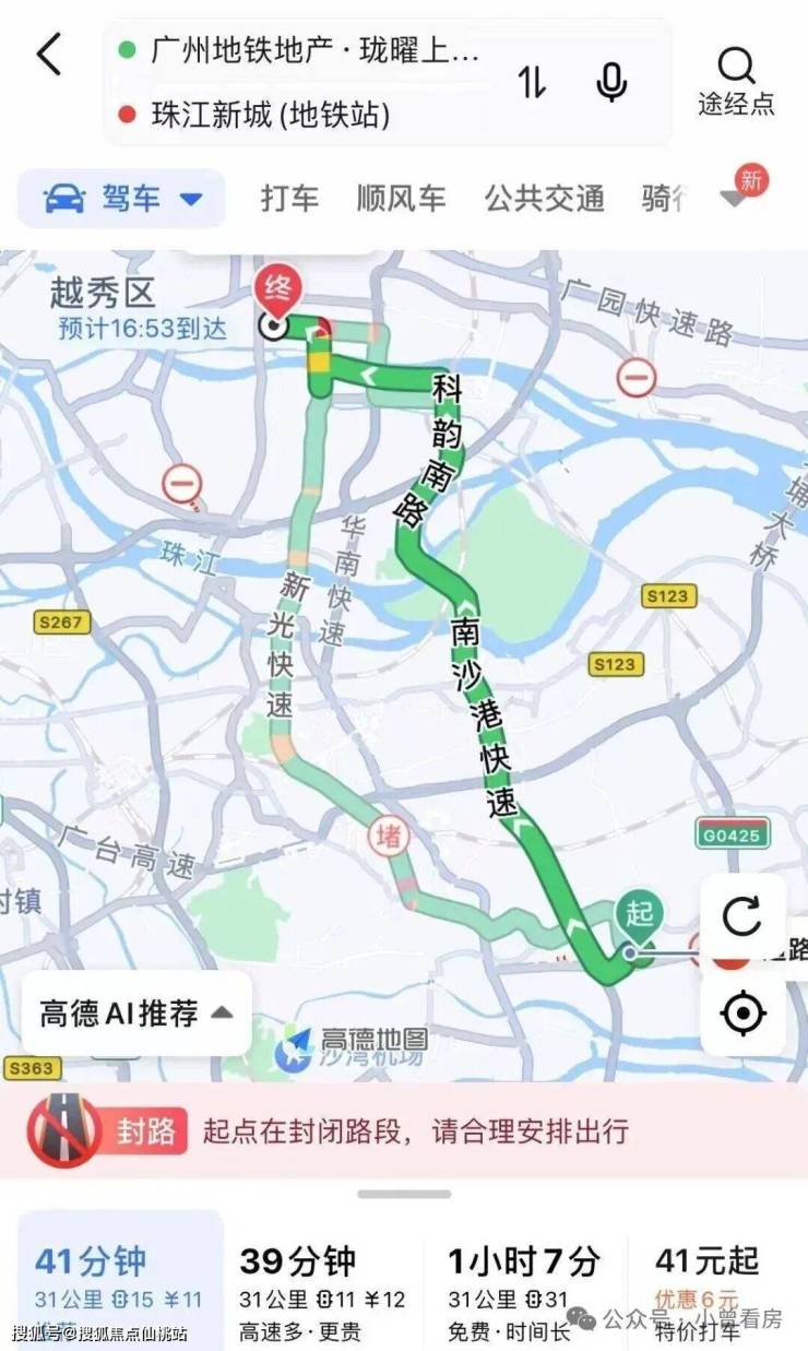 自驾的话也是非常方便,项目距离南沙快速港仅900米,附近还有亚运大道,接下来小何就给大家实测一下自驾或地铁通勤珠江新城、琶洲需要多久: