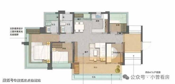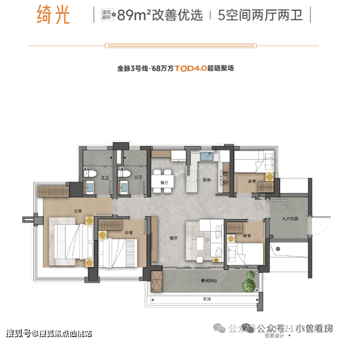 建面89平四房,该户型入户花园约12平,竖厅设计,约6.3米的宽景阳台链接了次卧,还能该做5房。