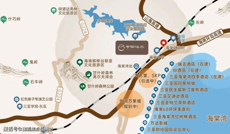海棠湾是海南唯一一个由国家规划打造的度假湾区,定位为国家海岸,22公里海岸线汇聚千亿配套,32家超五星级酒店、4大主题乐园、5大高尔夫球场、310解放军医院海南分院、亚洲最大单体免税店、华润超级万象城、北京华联SKP等资源环伺。中御海棠项目位于海棠湾南田片区,坐享东线高速、山海高速、机场、高铁、城际公交等三维立体交通网,度假生活出行四通八达。
