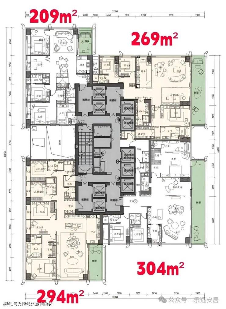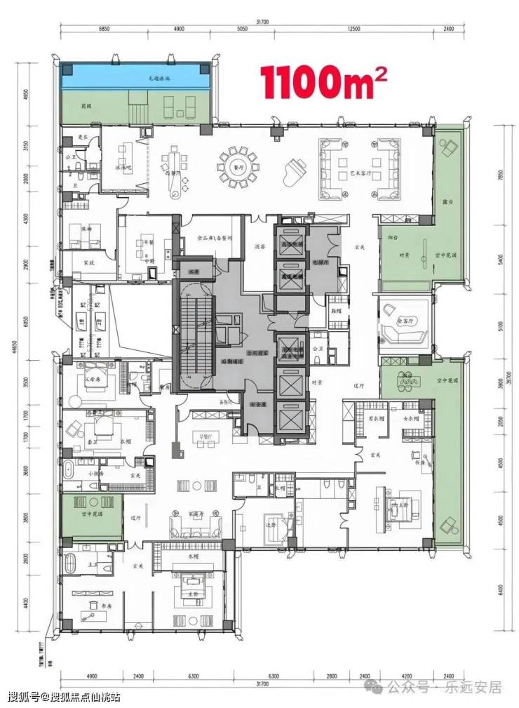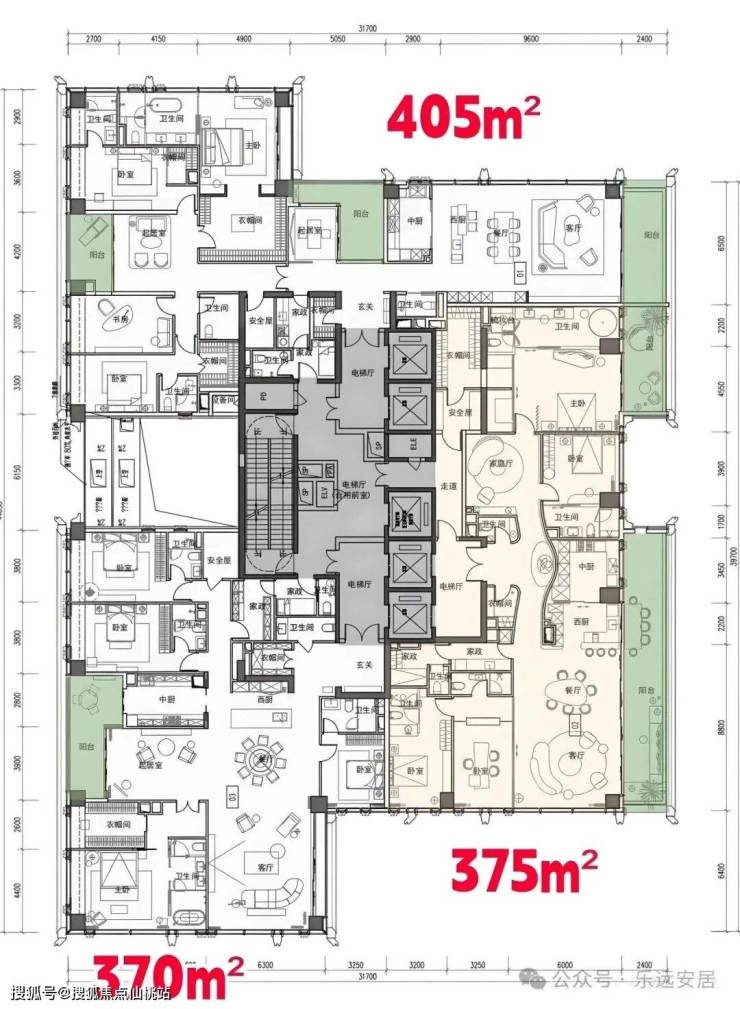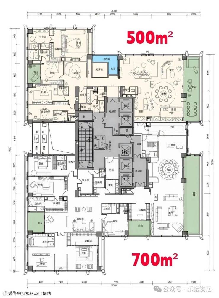 500㎡大平层, 客厅约10米进深、开间12.5米,阳台开间约12.5米,5房(4套房)700㎡大平层,客厅约13.5米进深、开间约11米。阳台开间约15.5米,5房(4套房)